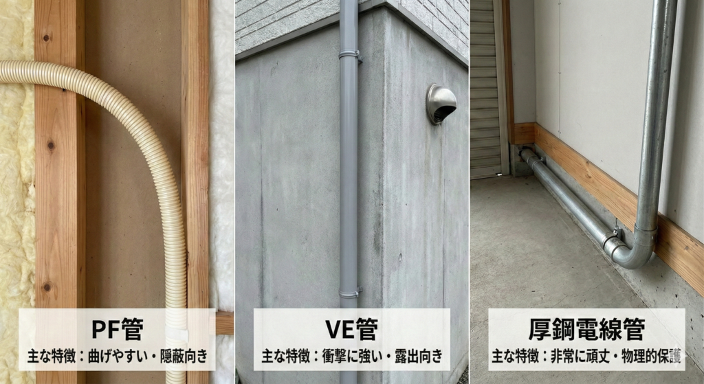 配線を保護する管(パイプ)にも、適材適所の選び方があります。
